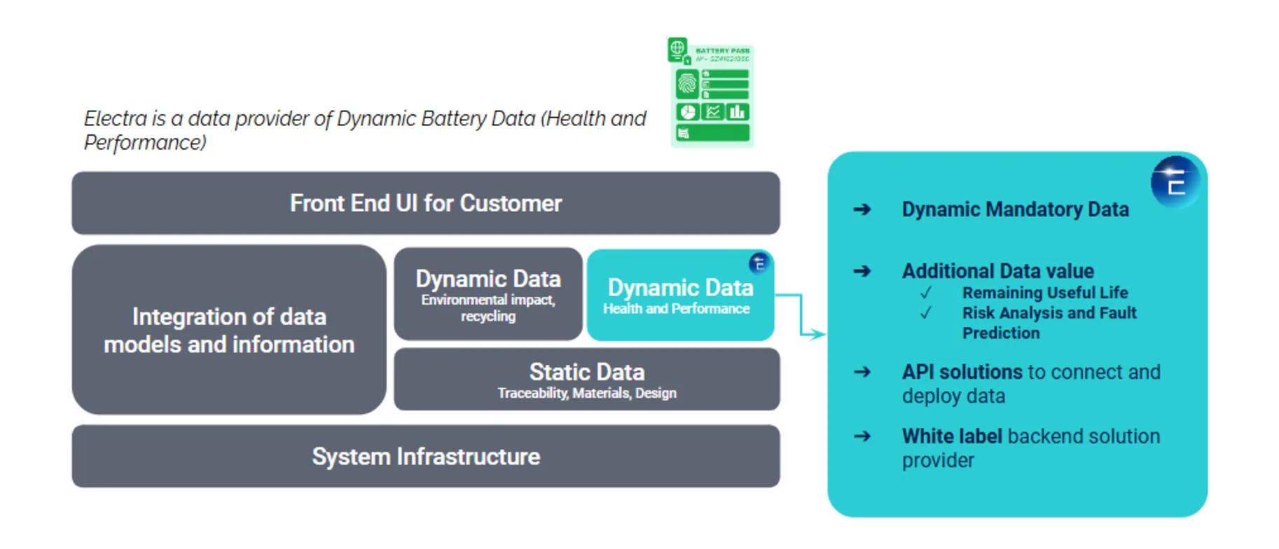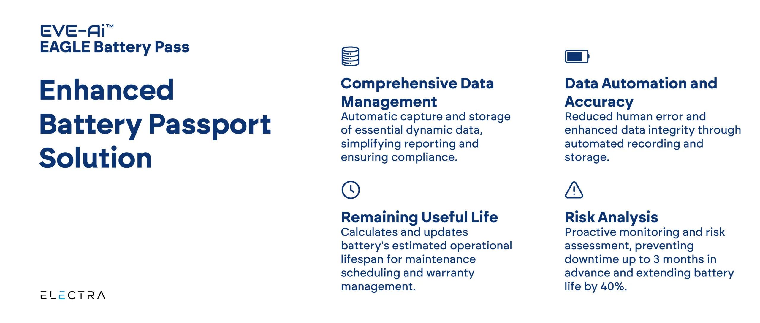 Electra’s EVE-Ai – EAGLE-Battery Pass transforms EU Battery Passport compliance into a strategic asset for companies across the battery lifecycle. With robust data management, automated accuracy, real-time insights into Remaining Useful Life, and proactive risk analysis, EVE-Ai – EAGLE-Battery Pass not only ensures compliance but also optimizes battery performance, extends lifespan, and reduces operational costs—positioning businesses for success in a sustainable, data-driven future.